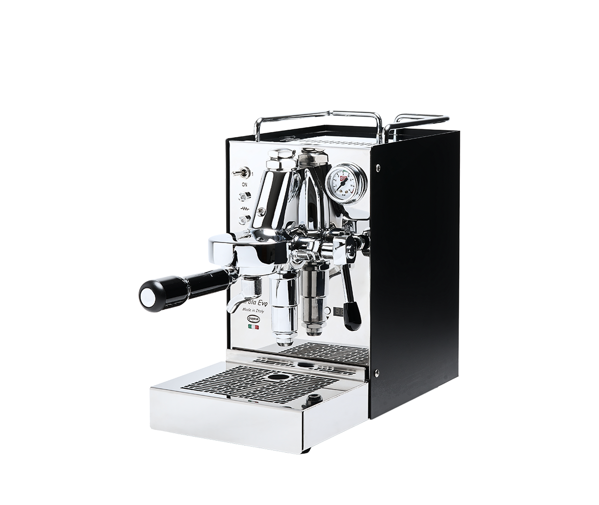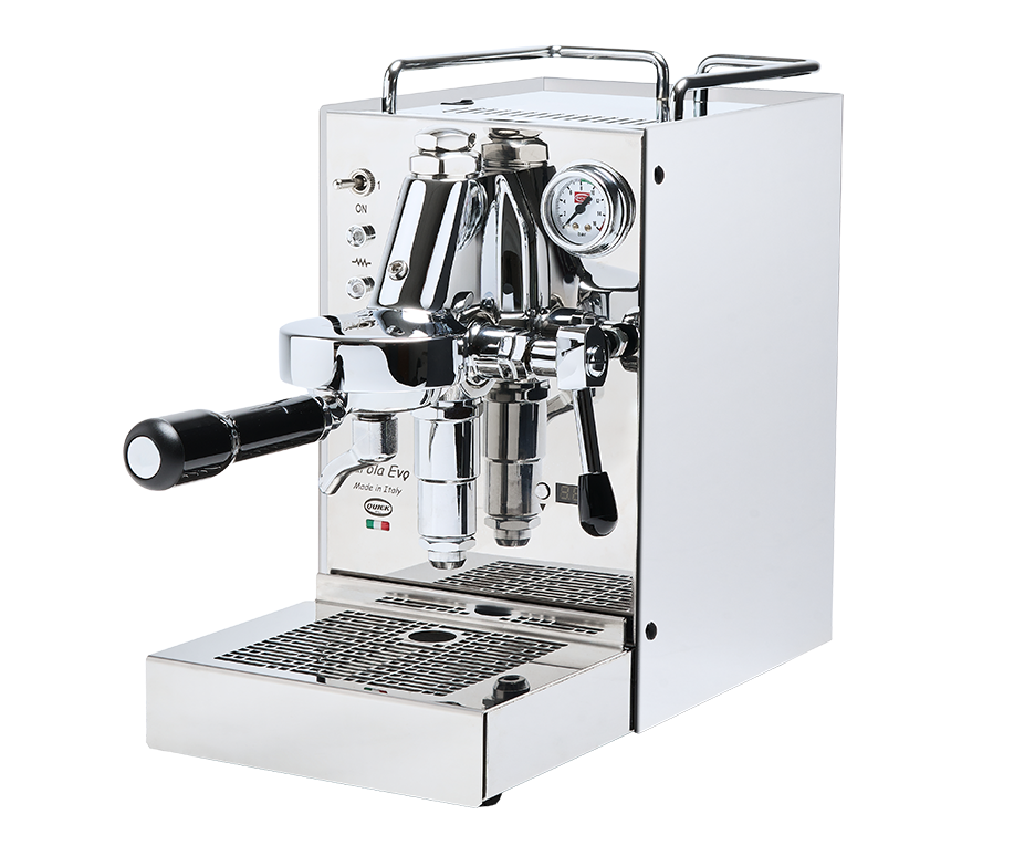 Material: Aço inoxidável completo; painéis laterais em aço ou preto mate; grupo Quick Mill com mushroom em aço inoxidável
