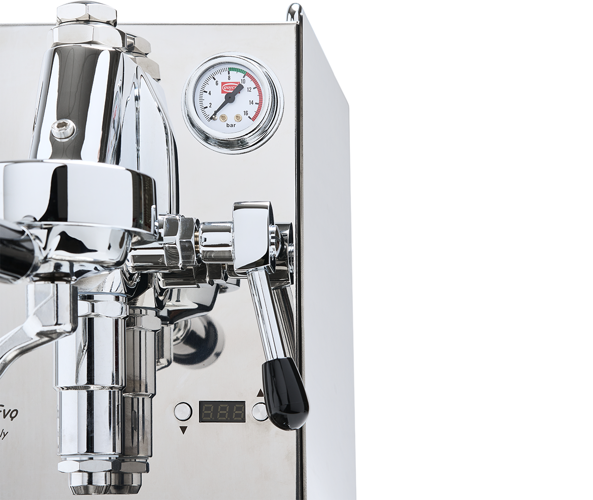 O display integrado mostra temperatura, temporizador do shot, nível de água e definições. O manómetro (0–16 bar) e os comandos clássicos de alavanca tornam a operação intuitiva e precisa.