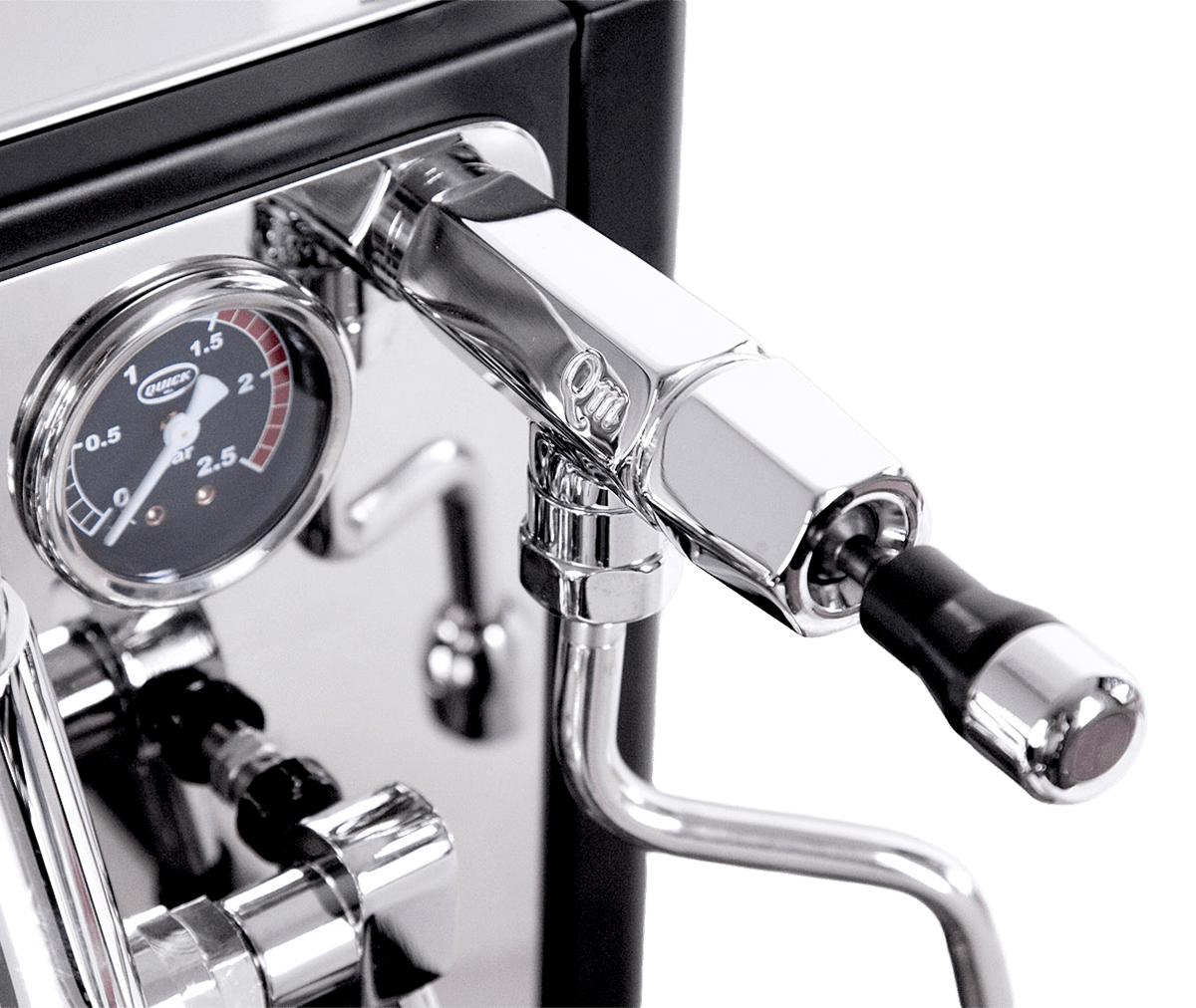 Medidores separados mostram a pressão da bomba (0–16 bar) e a pressão da caldeira (0–3 bar). Isso oferece uma visão perfeita para o ajuste fino da extração.