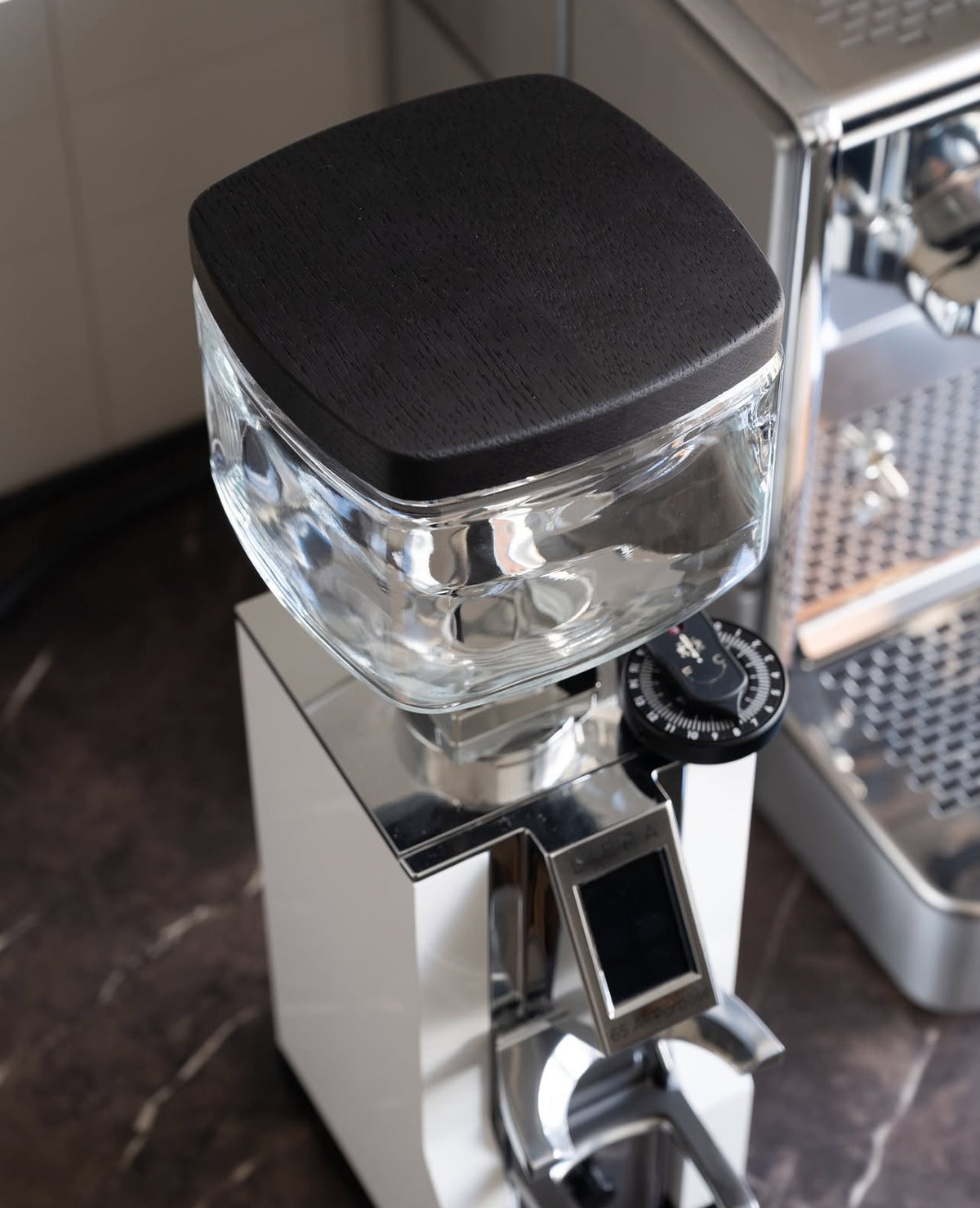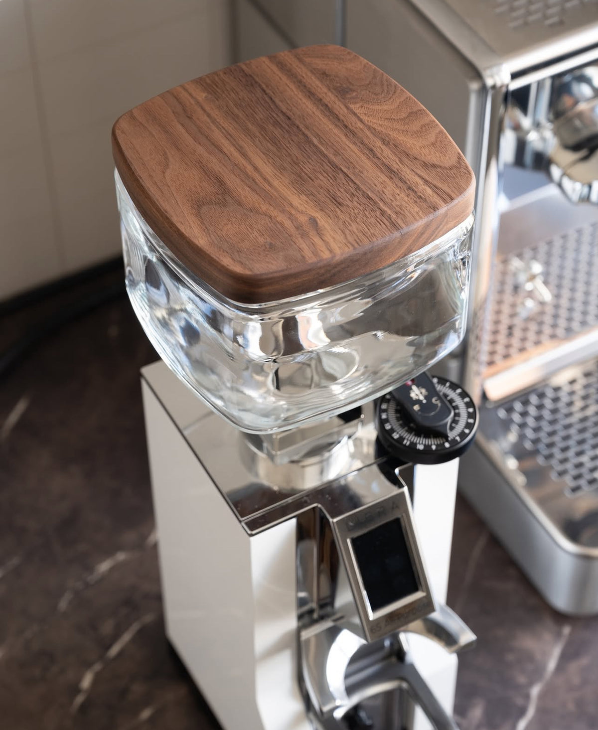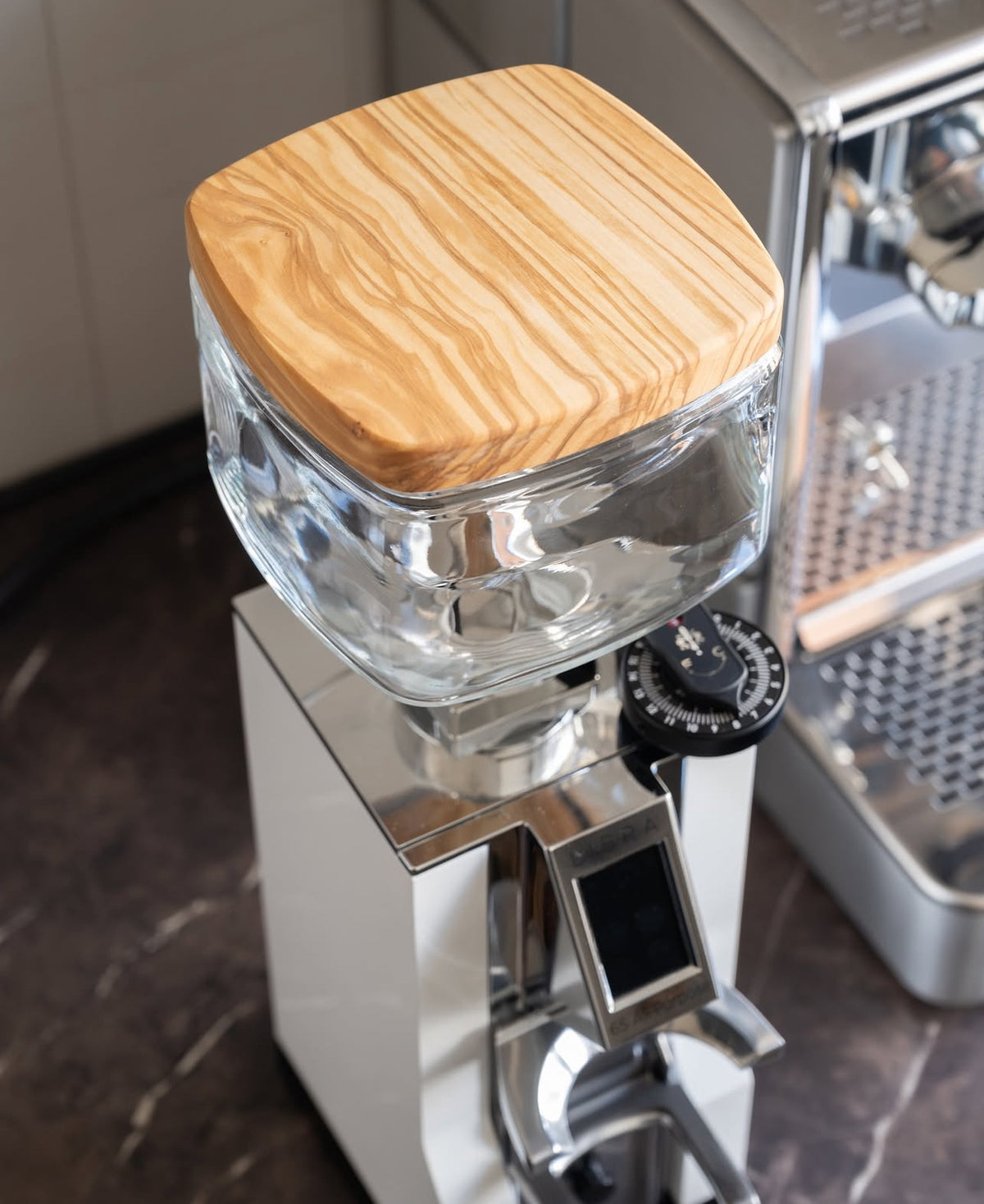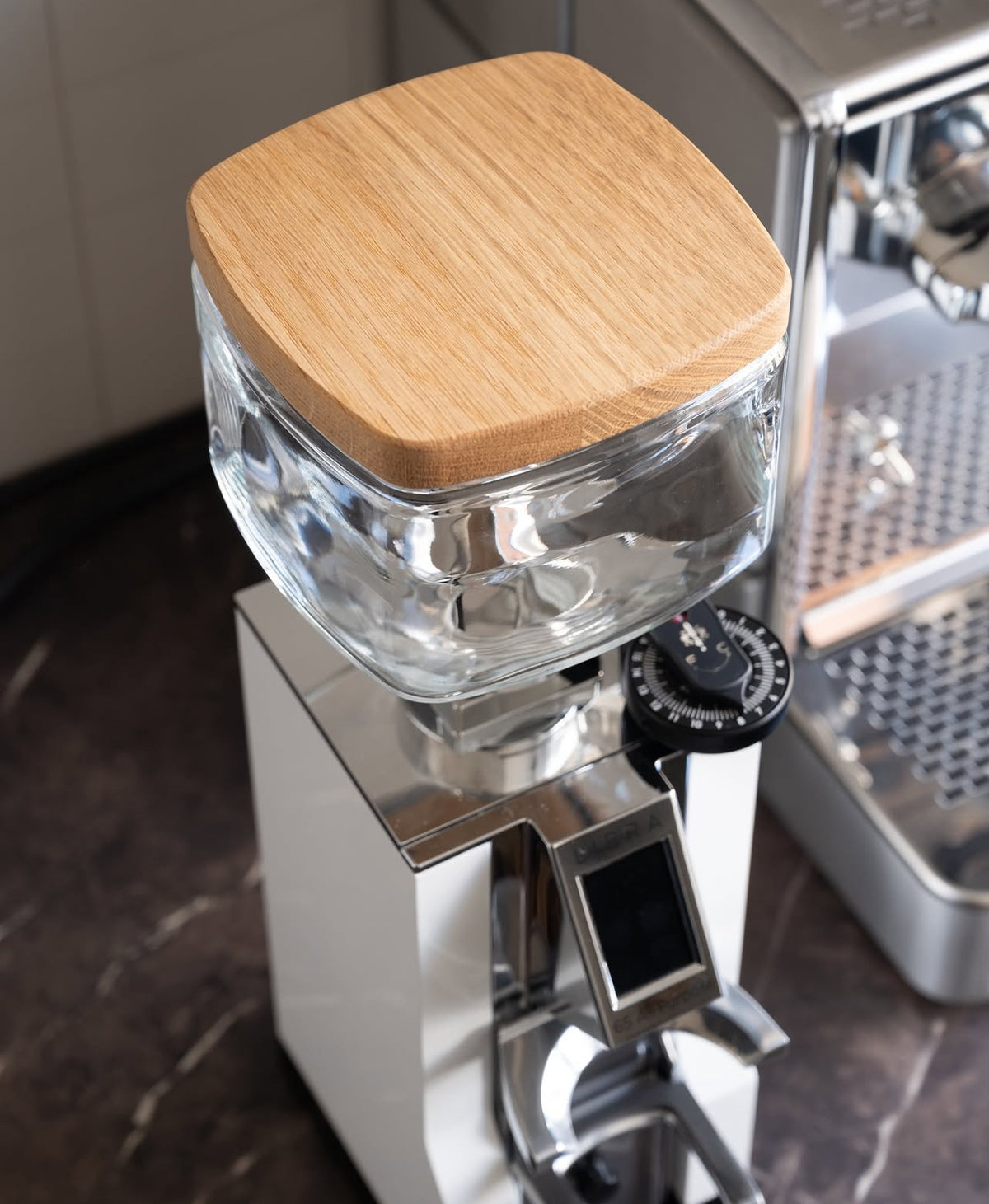 Esta tampa de madeira maciça feita à mão é feita sob medida para Eureka Recipiente de vidro de 500 g da Mignon. Uma maneira simples, mas elegante, de aprimorar a sensação e a aparência do seu moedor de café – perfeito para quem aprecia materiais com alma.