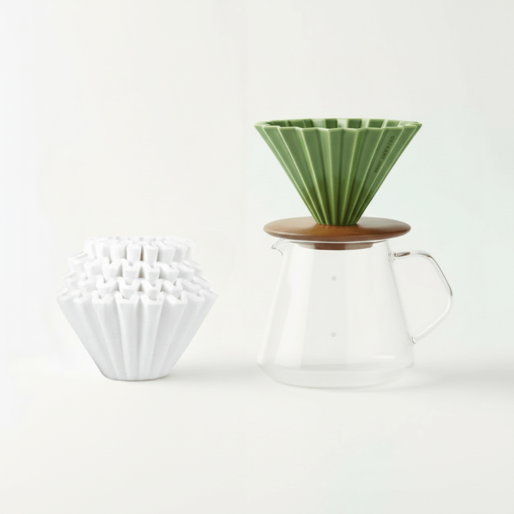 - Origami Dripper M – Dripper japonês em cerâmica com design único estriado. Escolha entre as cores verde, branco, vermelho ou preto