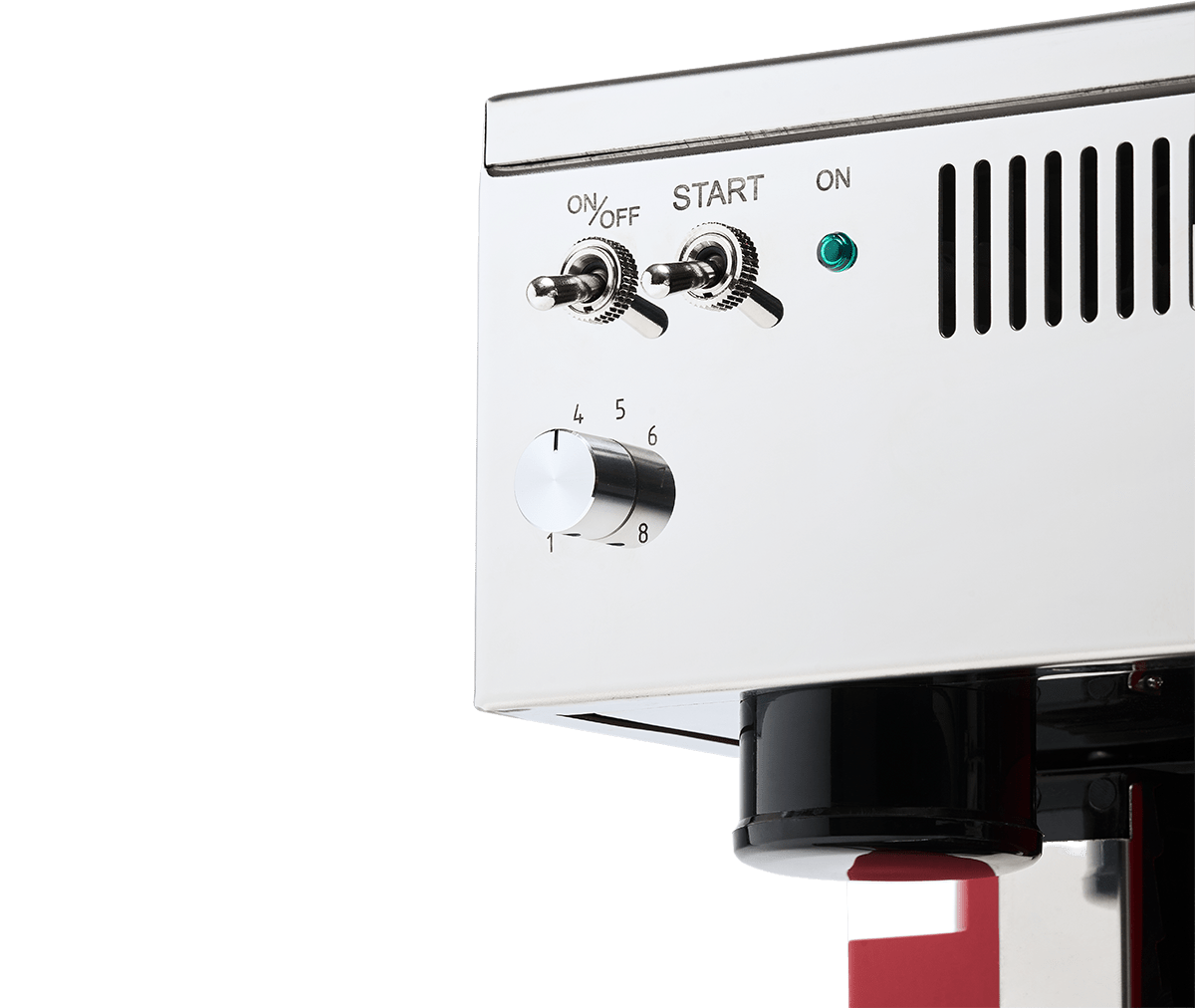 A máquina é controlada por alavancas clássicas, luzes indicadoras e um tamper incorporado — uma experiência completa e simples “do grão à chávena”.