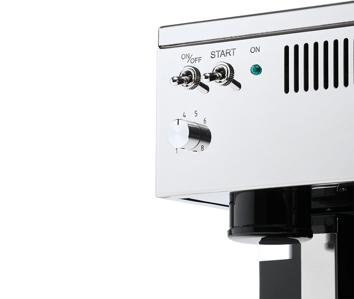 O Retrò possui um moinho de espresso integrado com discos planos de 43 mm que garantem tamanho de partículas uniforme e melhor extração. O ajuste gradual da moagem e o controlo de dosagem facilitam encontrar a configuração ideal para os seus grãos.